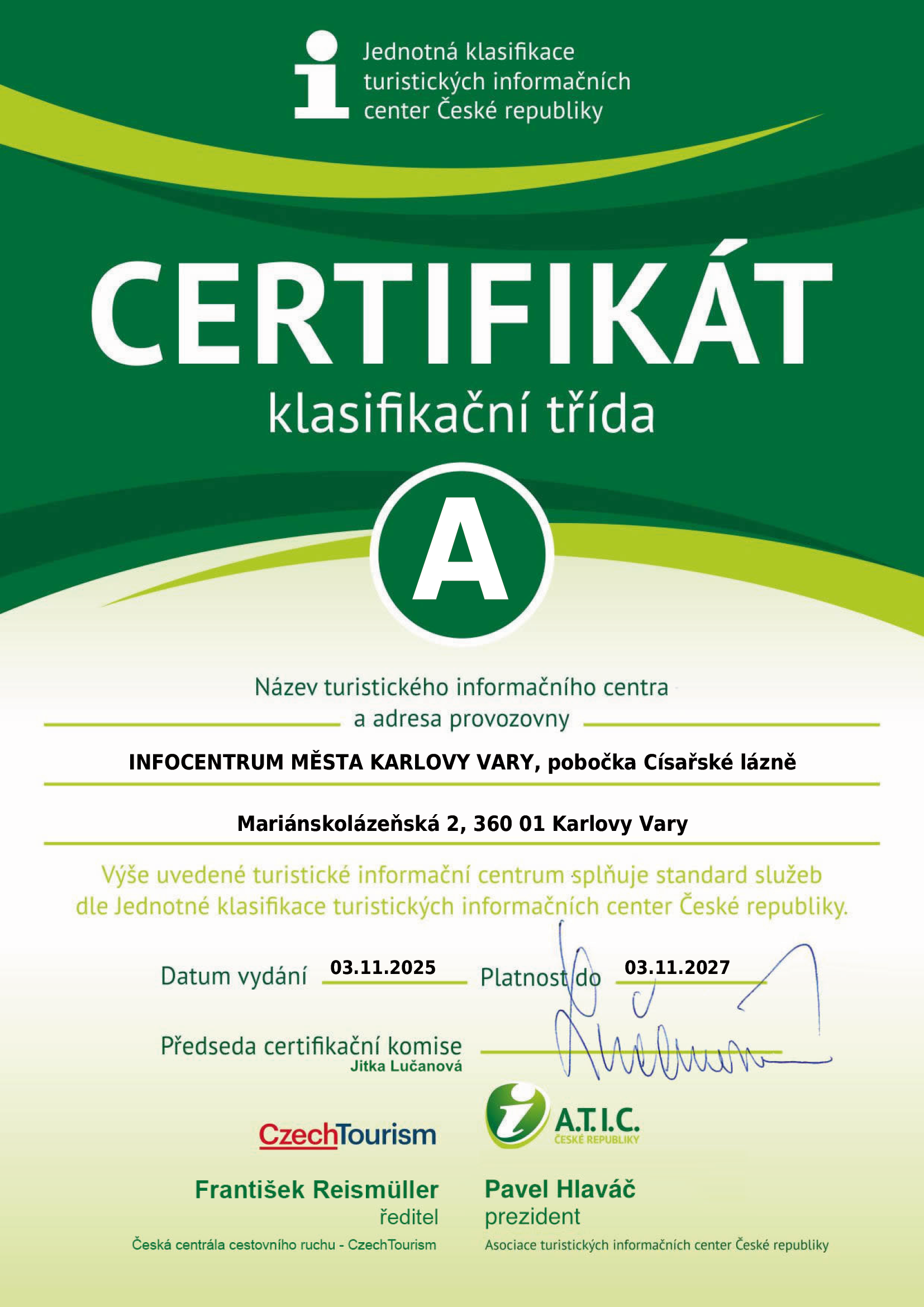 Infocentrum města Karlovy Vary o.p.s. je členem Asociace turistických informačních center České republiky. Nově jsme dosáhli na klasifikaci třídy A u obou našich provozoven.