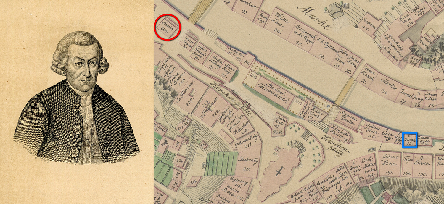Porträt von David Becher aus dem 19. Jahrhundert / Plan von Karlsbad aus dem Jahr 1831 – das Haus „Sklavin“ ist rot markiert, das Haus „Zwei Ketten“ blau