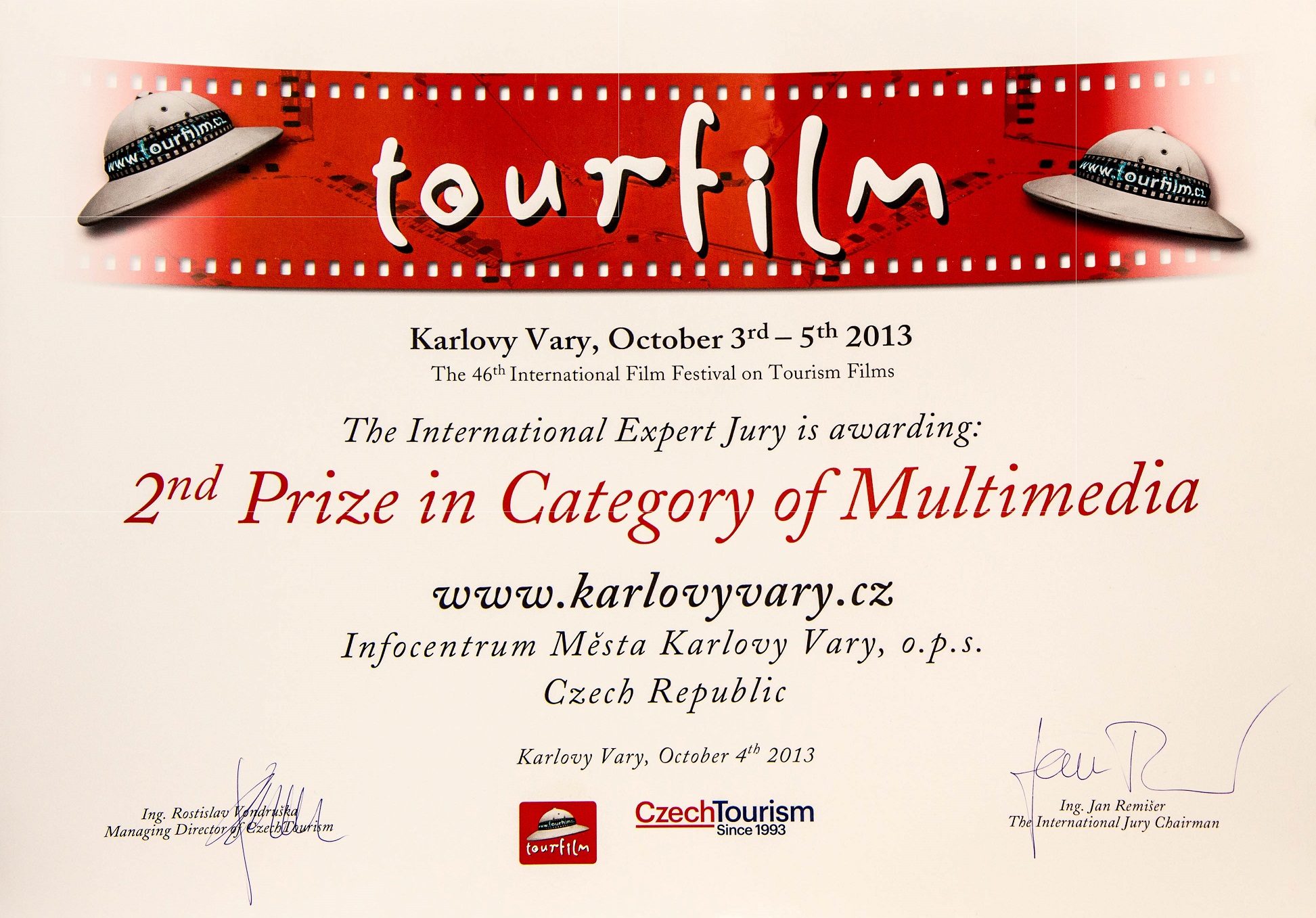 Infocentrum města Karlovy Vary o.p.s. získalo ocenění za web www.karlovyvary.cz na festivalu Tourfilm 2013.