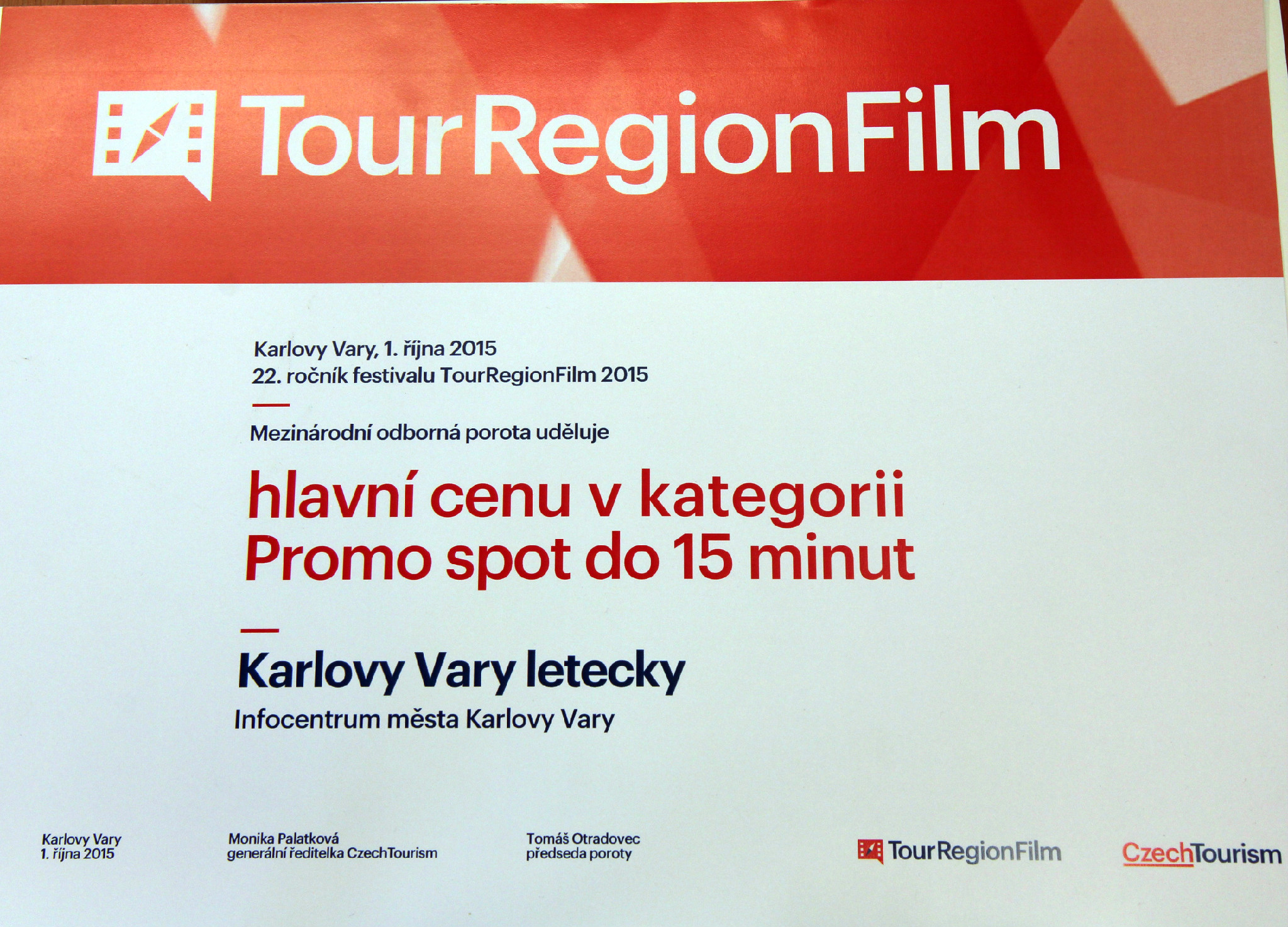 Infocentrum města Karlovy Vary o.p.s. získalo ocenění v kategorii Promo spot do 15 minut na Tour Region Filmu 2015.