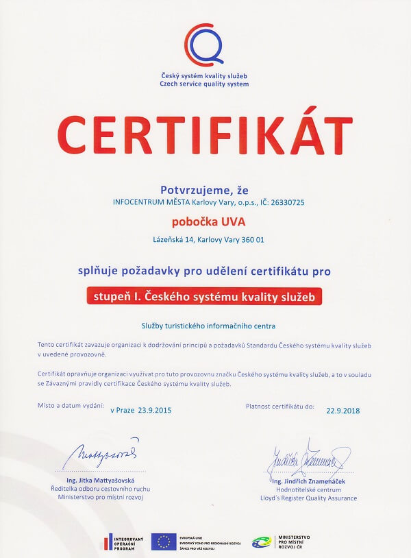 Infocentrum města Karlovy Vary o.p.s. je členem Asociace turistických informačních center České republiky. Nově jsme dosáhli na klasifikaci třídy A u obou našich provozoven.